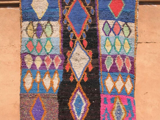 Parmi les principales caractéristiques de ce tapis, les motifs géométriques abstraits et colorés séduisent et se dénotent des autres types de tapis (comme le tapis Zanafi, qui est tissé avec des couleurs neutres).